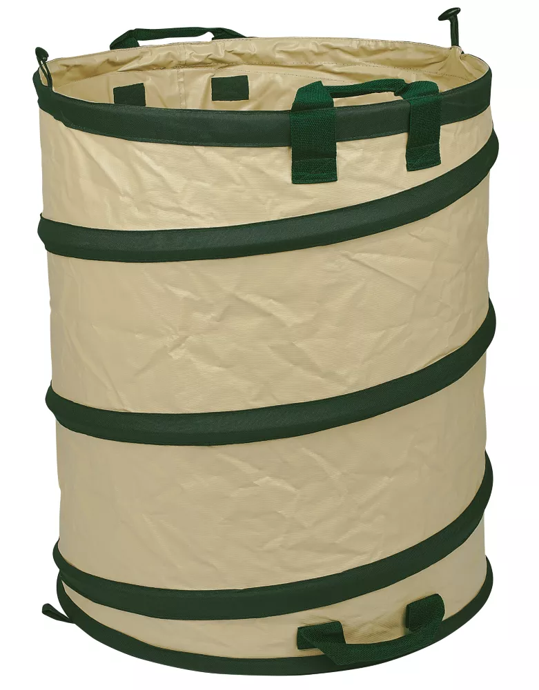 Receptacle with carrying handles, for light garden waste, leaves and lawn clippings. Made from a durable Nylon. Folds flat for easy storage.