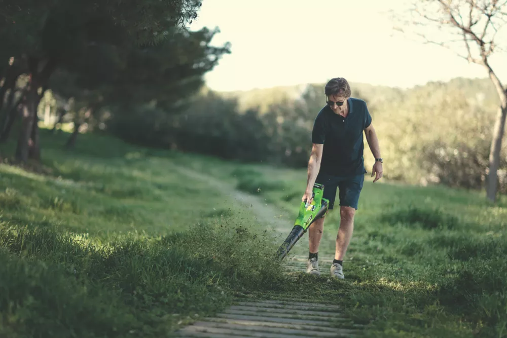 Lightweight cordless blower with axial fan. Can manage soggy leaves with ease. Suitable for one-handed motor control with left or right hand due to its multifunctional and ergonomic handle. Cruise control throttle to set and maintain speed. Compatible with 40V Greenworks battery (available separately).