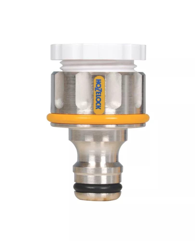 Nickel-plated brass threaded tap connector for outdoor taps. Converts outdoor taps to the Hozelock quick-connect system.