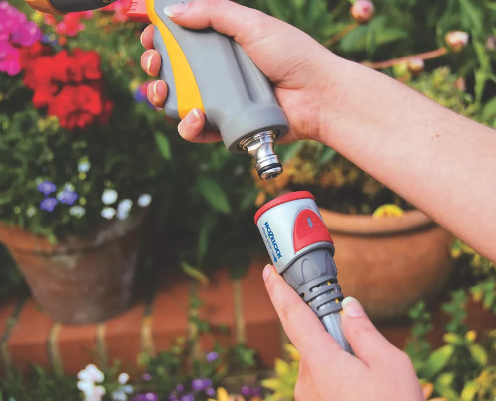 Die-cast zinc sleeve ensures strong, durable and scratch-resistant connection. Tough engineering plastics for a long, leak-free life. Twin soft-touch pads for easy of use, even when wet. Best used at the gun end of a hosepipe. Automatically shuts off water when attachments are disconnected.