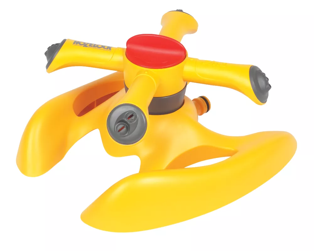 4-arm rotating sprinkler with jet spray for turf and established plants and mist spray for delicate plants or seedlings. Mounted on sled base to suit all surfaces. Complete easy-grip adjuster ring.