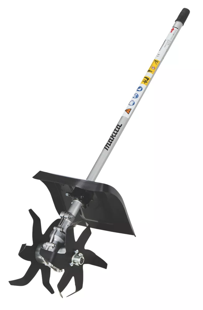Compact cultivator attachment for the Makita DUX60 cordless split shaft machine. Suitable for work in tight spaces. Easy to attach and remove. Steel drive shaft helps to provide robustness and low vibration.