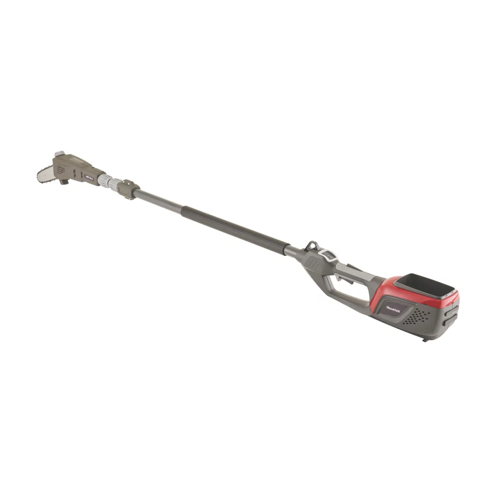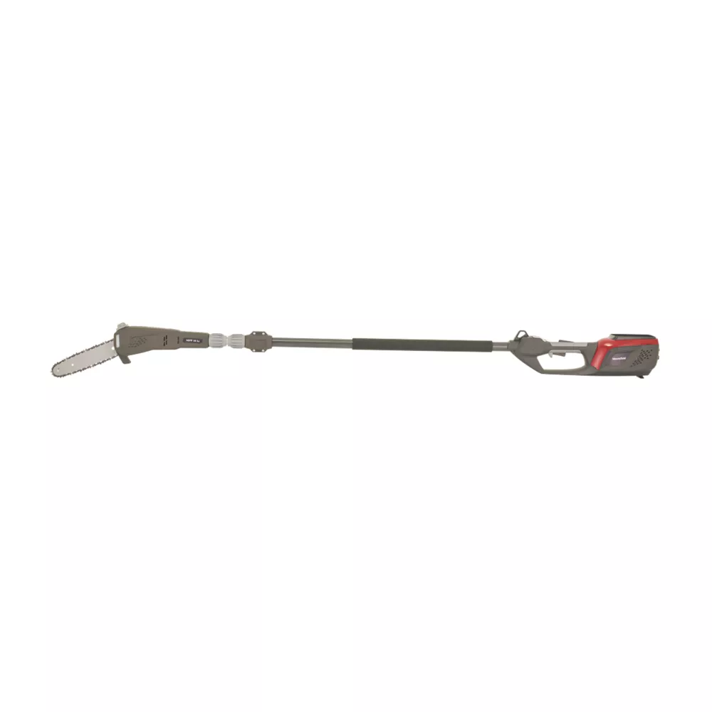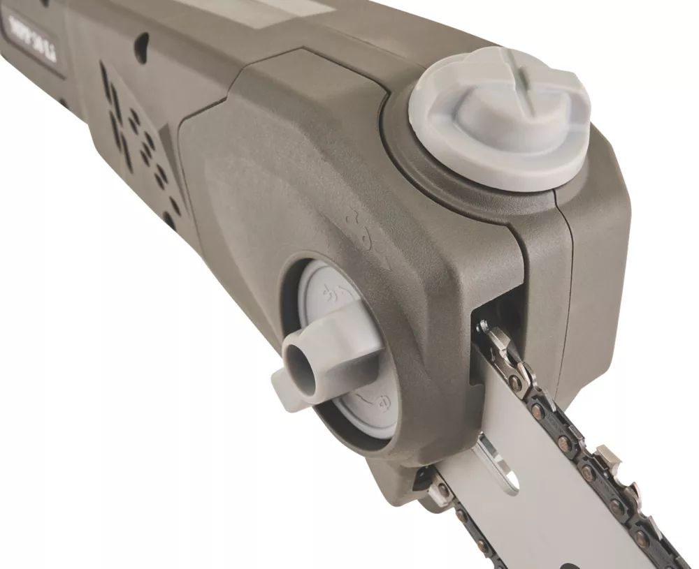 Long-reach pruner with a brushed motor and a cutting bar with high performance chain. Features a 65cm telescopic extension shaft capable of reaching up to 4m for hard to reach pruning jobs. Cutting attachment with integrated bumper to lean against branches for a precise cut. Electronic control panel for easy use. Battery and charger available separately.