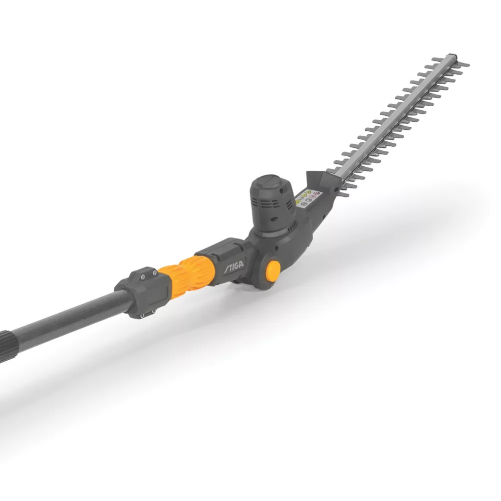 Lightweight cordless multi-tool offers high-reach hedge cutting and pruning without the noise and fumes of a petrol tool. Features 46cm dual-action laser-cut blade and 25cm cutting bar designed to fit into tight spaces, with bumper to lean against branches. Supplied with 65cm telescopic extension for a maximum reachable height of 2.95m with hedge trimmer and 2.7m with pruner saw. High-performance chain on cutting bar minimises kickbacks. Also features 112° rotating cutting head with 6 positions, soft-touch rubber grip handle and shaft, and harness hook for a safe, comfortable and precise cut. Compatible with 48V 2.0Ah battery (sold separately).