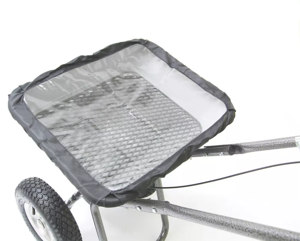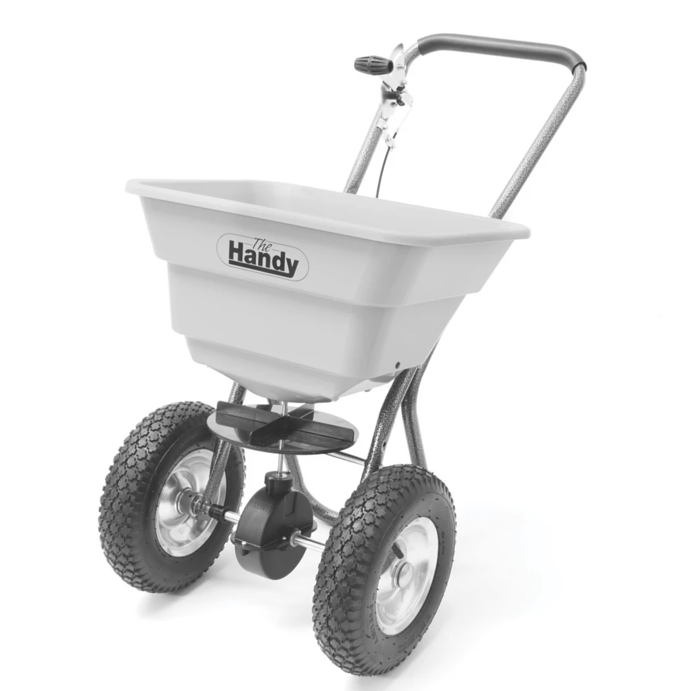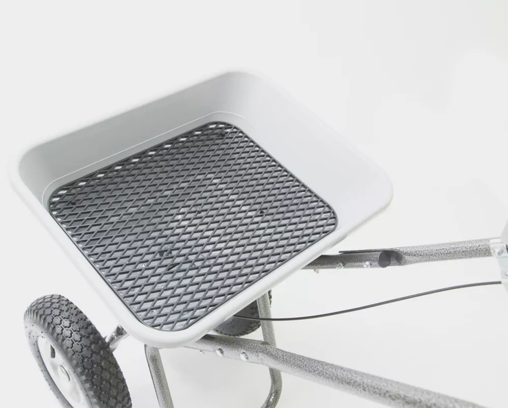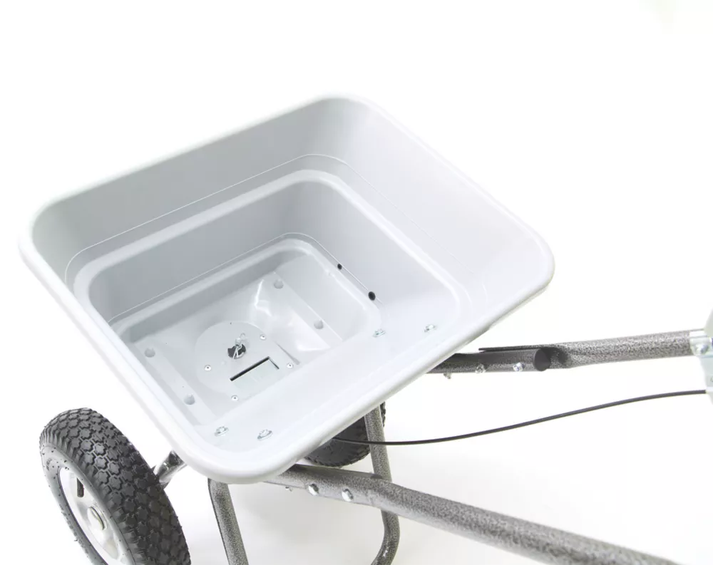 Tough, long lasting spreader. Rotary agitator stirs to deliver the material constantly, reliably and efficiently. Pneumatic wheels for easy transportation. Easy to operate. Ideal for fertiliser, granules and grass seed.