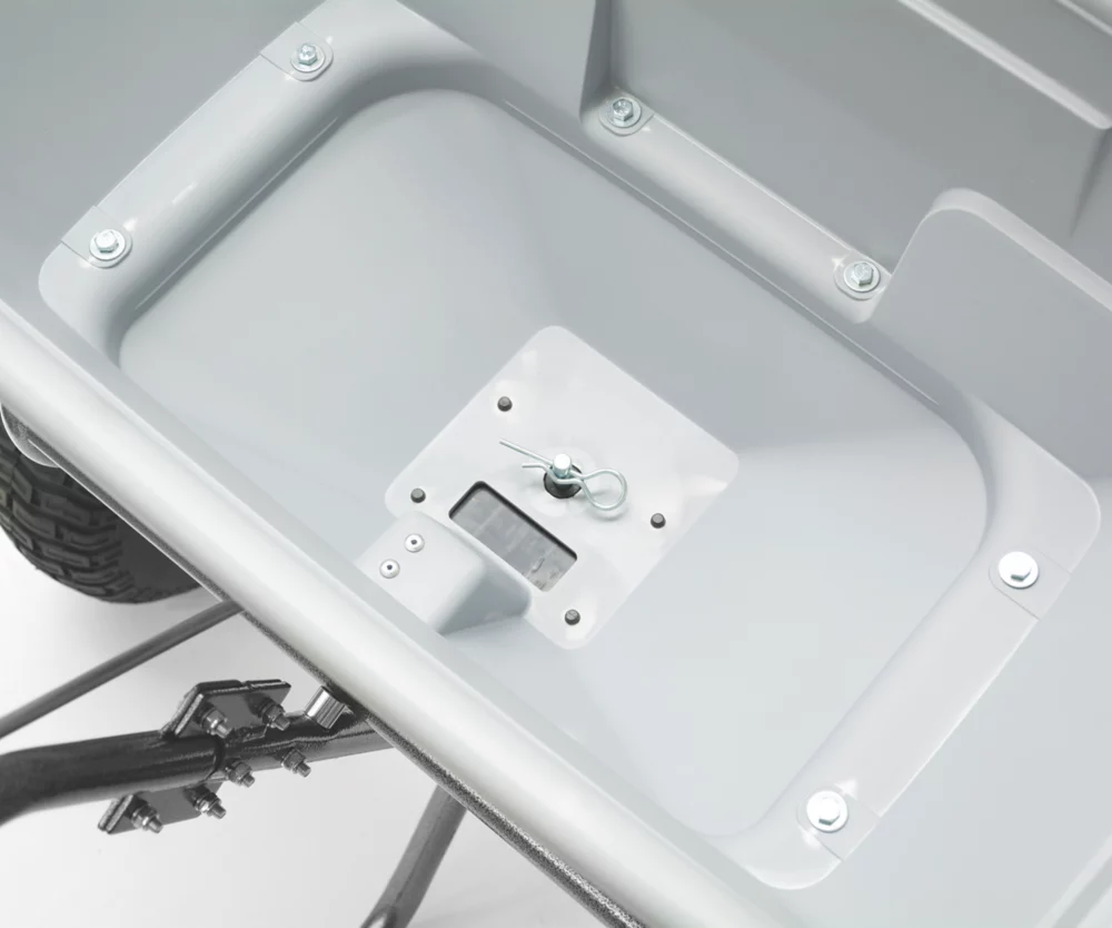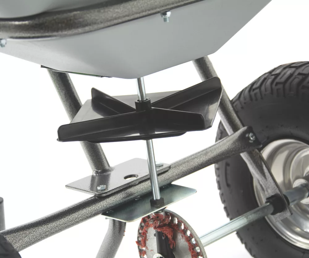 Large spreader with non-corrosive poly hopper for maximum coverage on large areas. Pneumatic wheels for easy transportation. Ideal for fertilizer, granules, grass seed and winter salt.