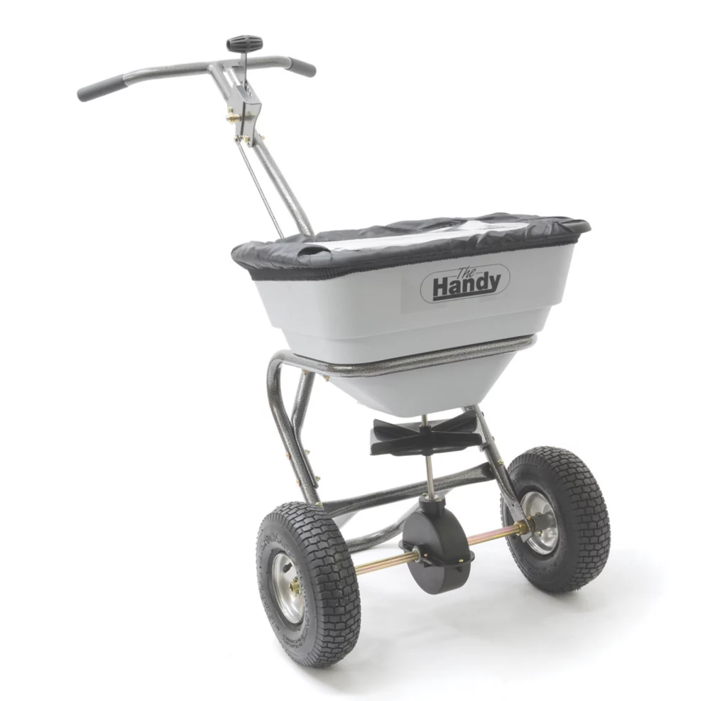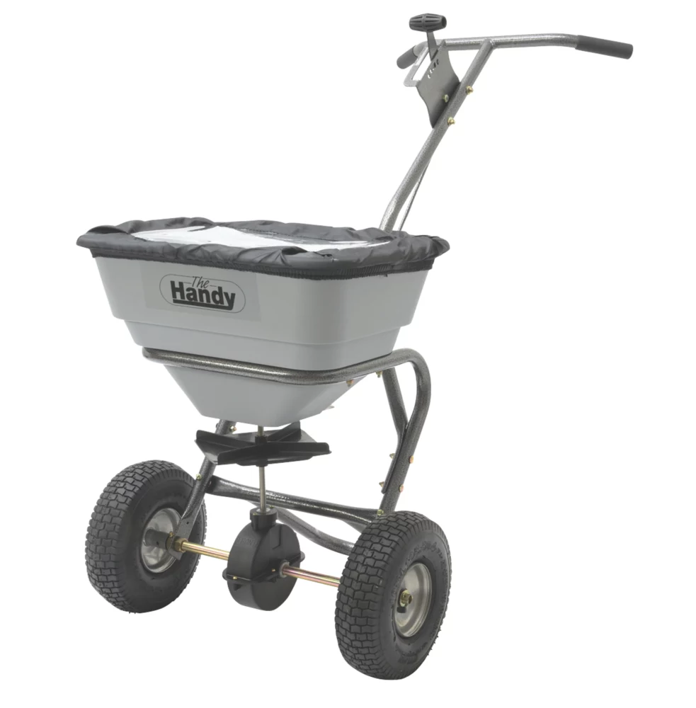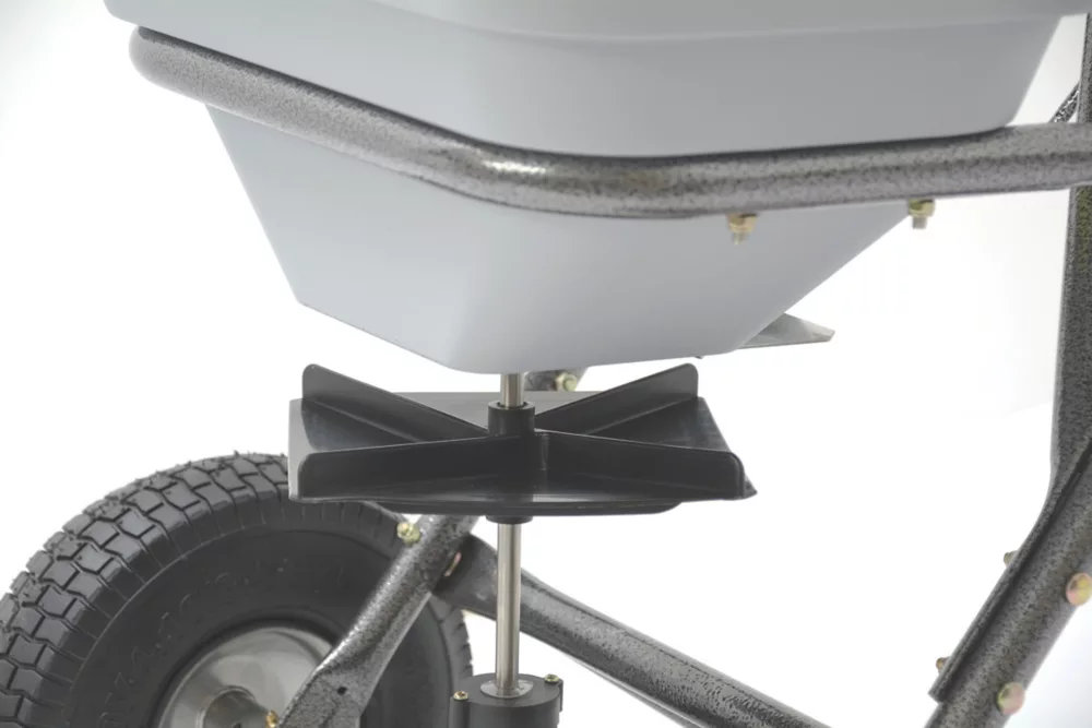 Heavy duty spreader with robust metal gearing, a spacious hopper and an impressive spread-width. Features a comfortable T-bar handlebar, stability-optimising pneumatic tyres and a flexibility-enhancing adjustable feed-control. Can be used for spreading grass-seed, lawn-feed and pesticide or ice-melt and processed salt. Corrosion and weather-resistant polypropylene hopper. Equipped with a series of grease-nipples for easy routine maintenance and a hopper screen for clog-free operation in all weather conditions.