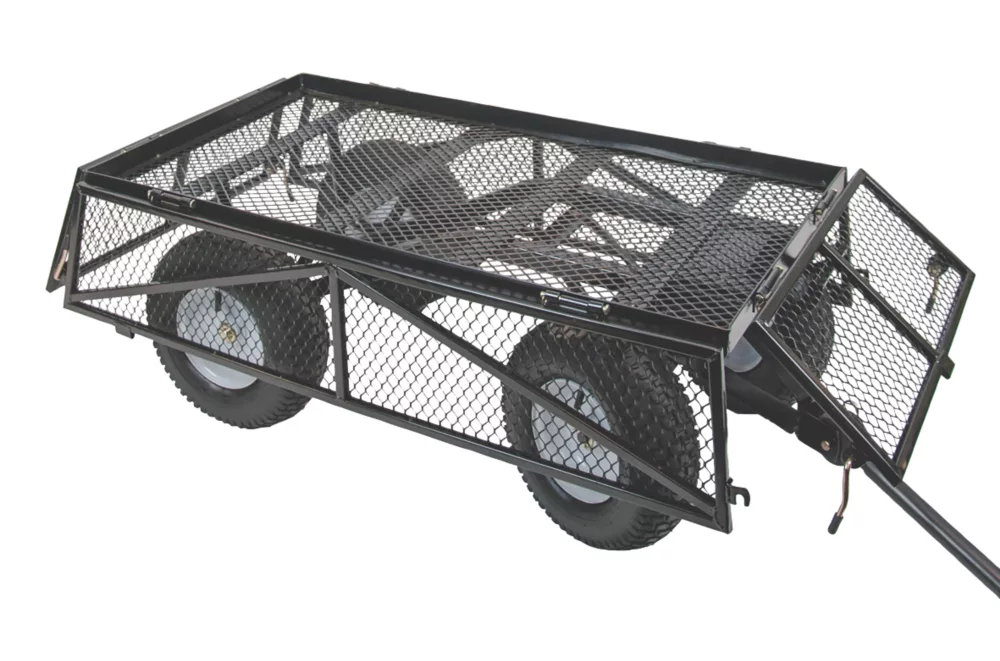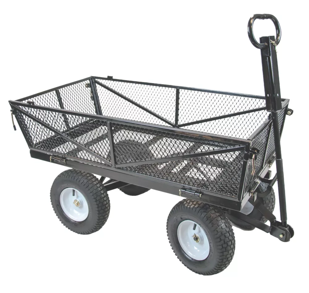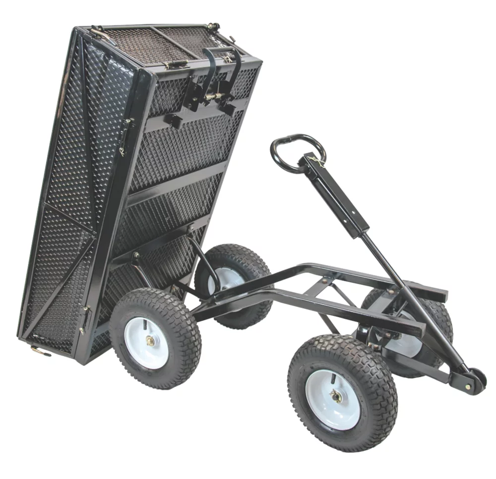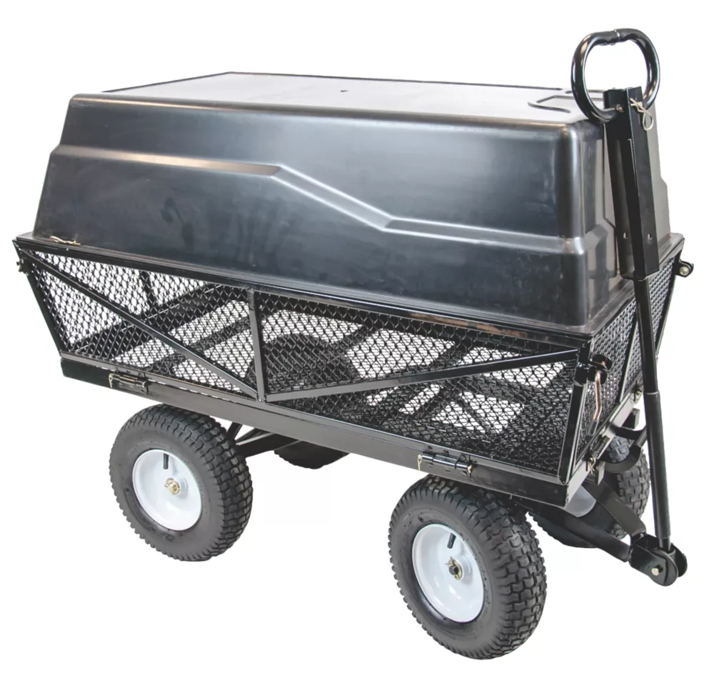 Versatile, multipurpose cart with folding drop-down side panels and handles which convert to tow hitch for use as a flat bed trailer. Removable solid poly liner. Durable powder-coated steel frame.