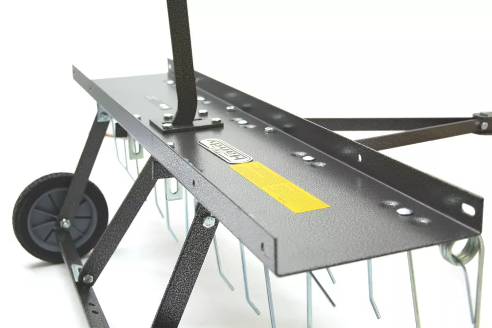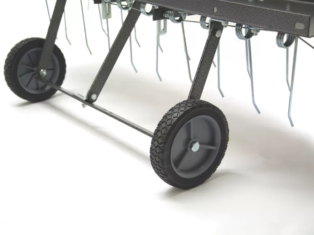 Designed to revitalise the turf. Sprung-loaded metal prongs penetrate down to soil-level, removing any moss, thatch or lateral rhizome build-up that might be inhibiting grass-growth. Equipped with a weight tray so it can be ballasted for deeper soil-penetration. Combines a transport handle with large wheels and a lightweight design for simple movement when not hooked-up. Supplied with a universal hitch-pin that makes it compatible with most garden tractors. Drag across the grass in a crisscross pattern for ideal results.