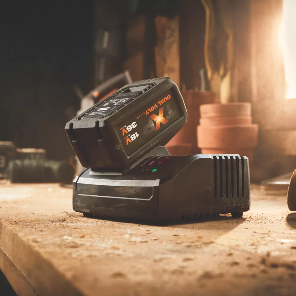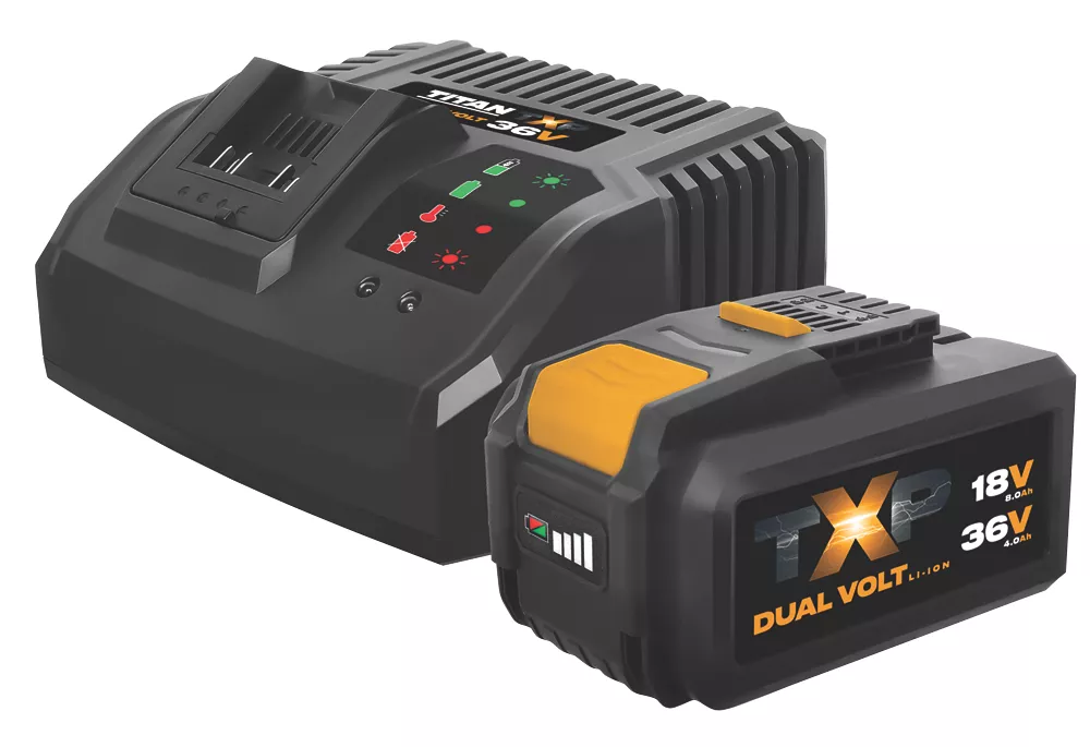 Versatile one-battery system. Battery compatible with any Titan TXP 18 or 36V tool. Charger compatible with Titan TXP 18/36V dual-voltage batteries only.